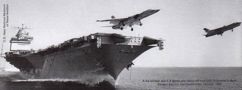 Бомбардувальник А-5А злітає з палуби «Ентерпрайза» разом з винищувачем F-8. Східна Атлантика, Карибська криза, жовтень 1962 Фото: coollib
