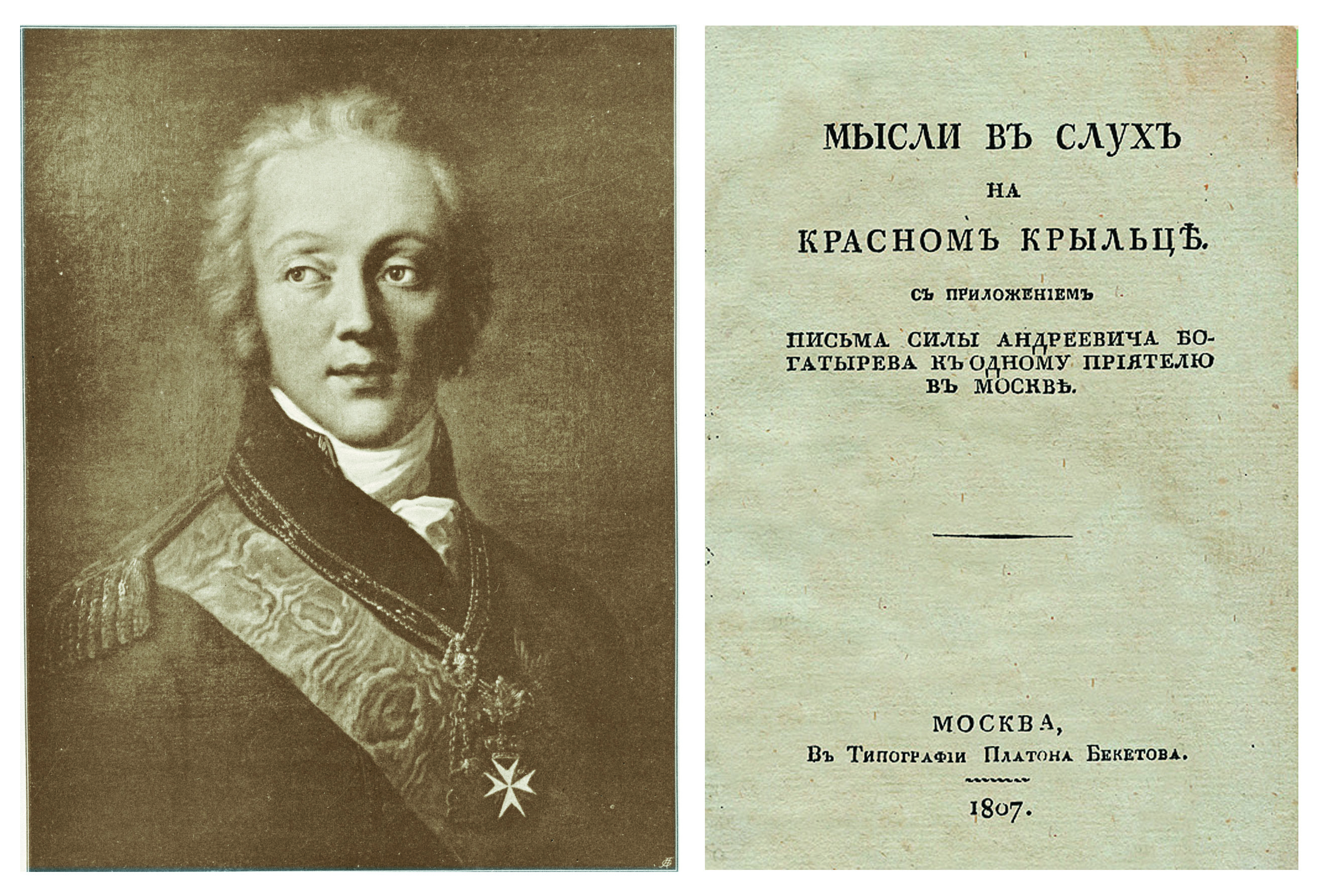 У липні 1807 року Росія і Франція помирилися, уклали між собою Тільзитський мир і стали союзниками. Переважна більшість російської аристократії не схвалювала цей крок Олександра І. Невдоволення дійшло до такої глибини, що для Олександра існувала реальна загроза нового двірцевого перевороту (до речі, був і претендент, точніше – претендентка – сестра Олександра Катерина Павлівна, яку багато хто вже бачив Катериною ІІІ). Тобто, могла повторитися ситуація березня 1801 року, коли Павла усунули від влади саме за його зближення з Наполеоном. У цій ситуації для Ростопчина, відомого французофіла, логічним було б стати на захист французької політики Олександра. Однак сталося якраз навпаки: граф «приєднався до більшості» і став активним критиком Тільзитської угоди (яка, по суті, була копією так і не підписаної угоди між Наполеоном і Павлом і яку так обстоював тоді Ростопчин). Причому він не обмежувався, як інші, бурчанням у світських салонах, а видав цілу книжечку під назвою: «Мысли вслух на красном крыльце ефремовского помещика Савы Андреевича Богатырева». Книжечка, написана в такому собі «народному» стилі, висміювала захоплення всім французьким загалом і Наполеоном зокрема.