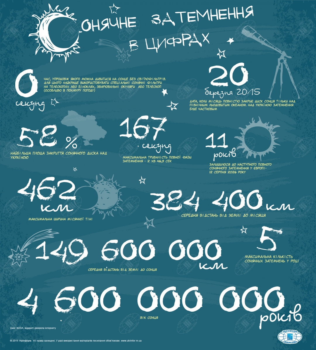 20 березня близько полудня Місяць повністю закриє диск Сонця тільки над Північним Льодовитим океаном, а над Європою, у тому числі над Україною, затемнення буде частковим. Над Львовом поверхня світила буде максимально закрита на 58%. Це станеться об 11:58. Над Києвом — на 52% сонячного диска (12:08). Над Одесою — на 43% (12:04).