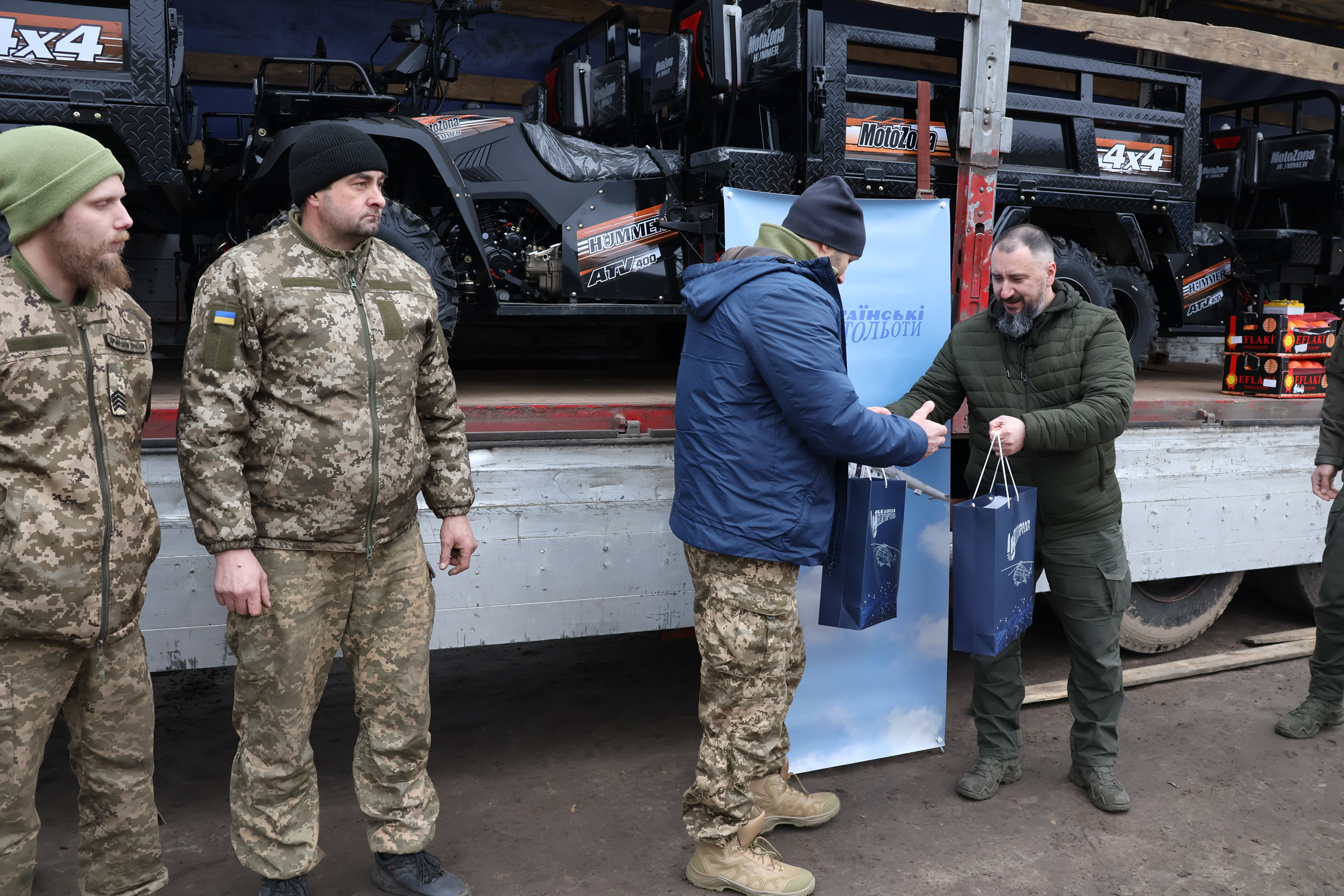 «118 бригада ТрО дякує від імені бійців і особового складу колективу Володимира Володимировича — “Українські вертольоти” за те що вони нас, акцентую увагу, не перший і навіть не другий раз підтримують. І як друзі, як міцний тил передають нам речі, ті, які конче необхідні для виконання бойових завдань», — заявив при отриманні квадроциклів офіцер логістики 118-ої бригади територіальної оборони імені отамана Лютого-Лютенка В’ячеслав Ситник.
