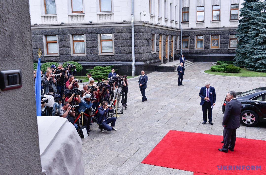 Як повідомляє кореспондент Укрінформу, урочиста церемонія зустрічі відбулася на ганку АПУ, після чого Петро Порошенко та Антоніо Гутерріш зайшли до будівлі на переговори.