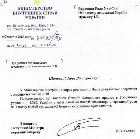 Про це йдеться у відповіді МВС від 5 жовтня на депутатський запит Ігоря Луценка, який він опублікував у своєму блозі на "Українській правді".