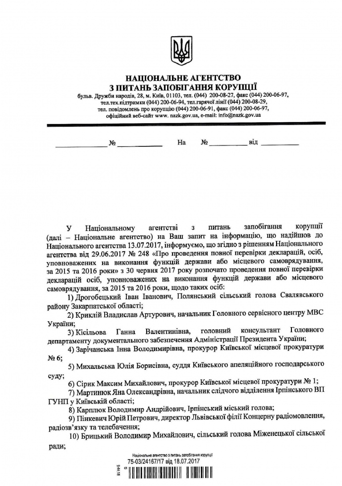 Згідно з документом, буде проведена повна перевірка декларацій Ірпінського міського голови Володимира Карплюка, депутата Херсонської міськради Сергія Білоковиленка, депутата Сумської облради – Віктора Ладухи.