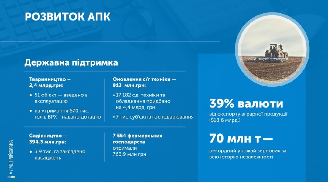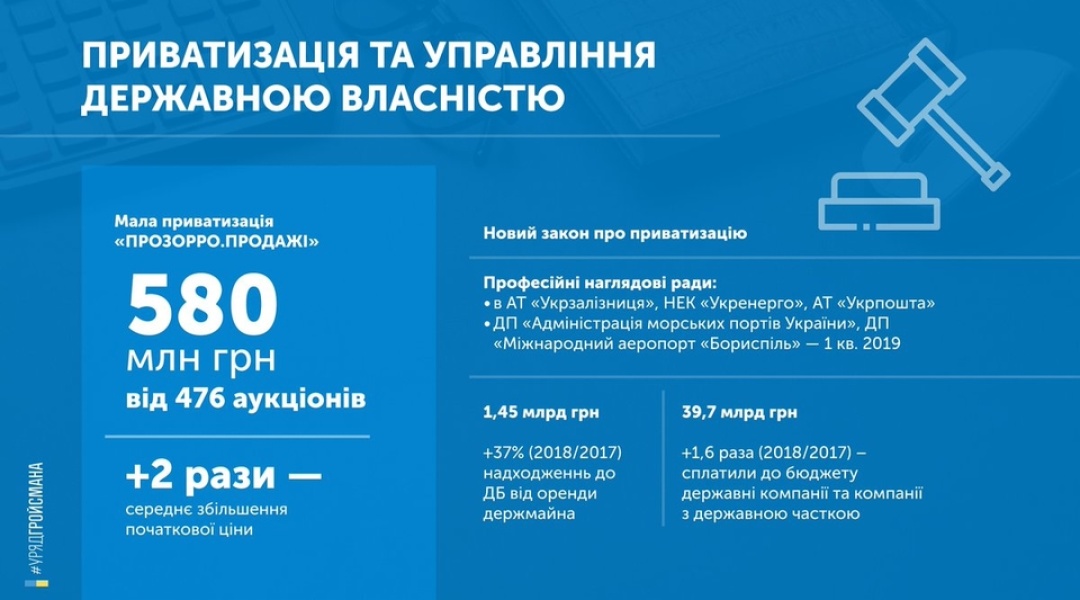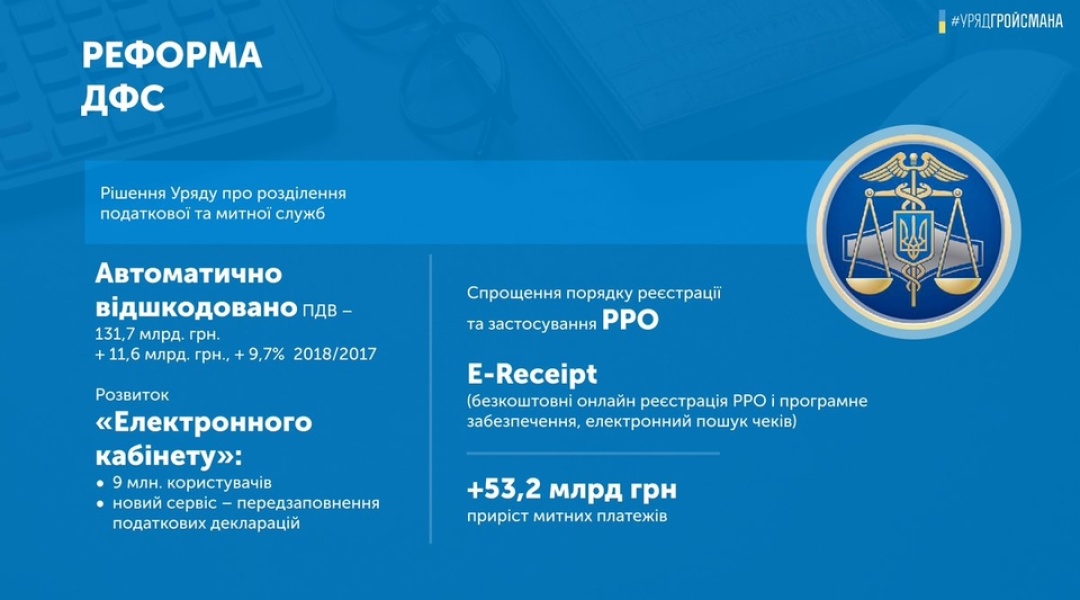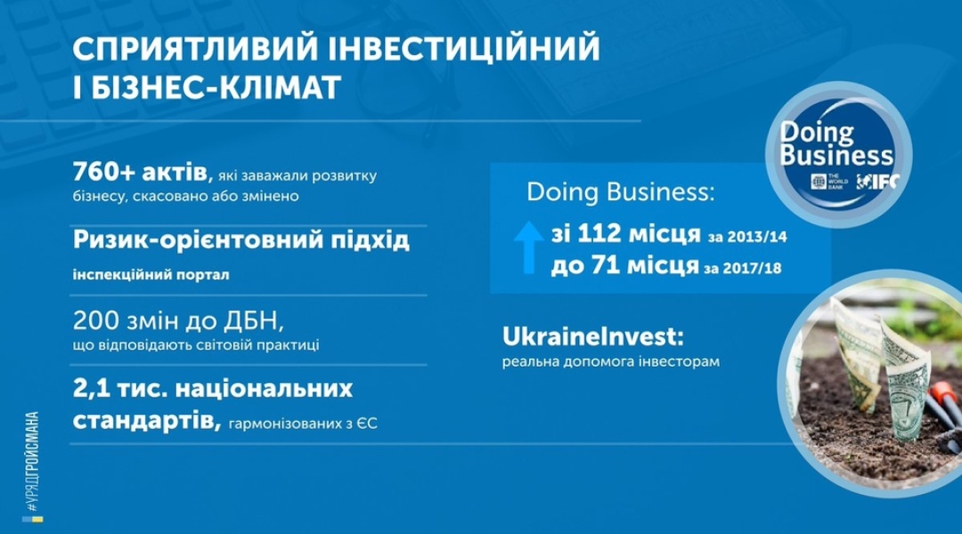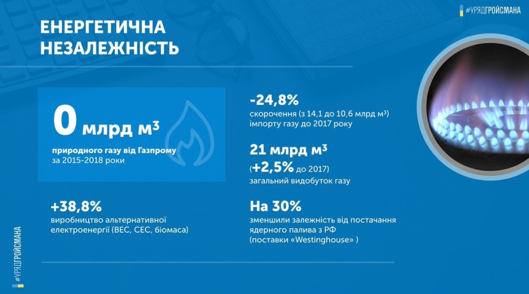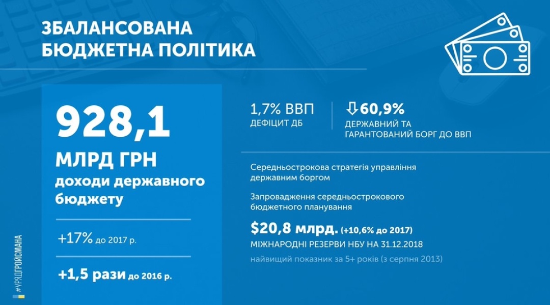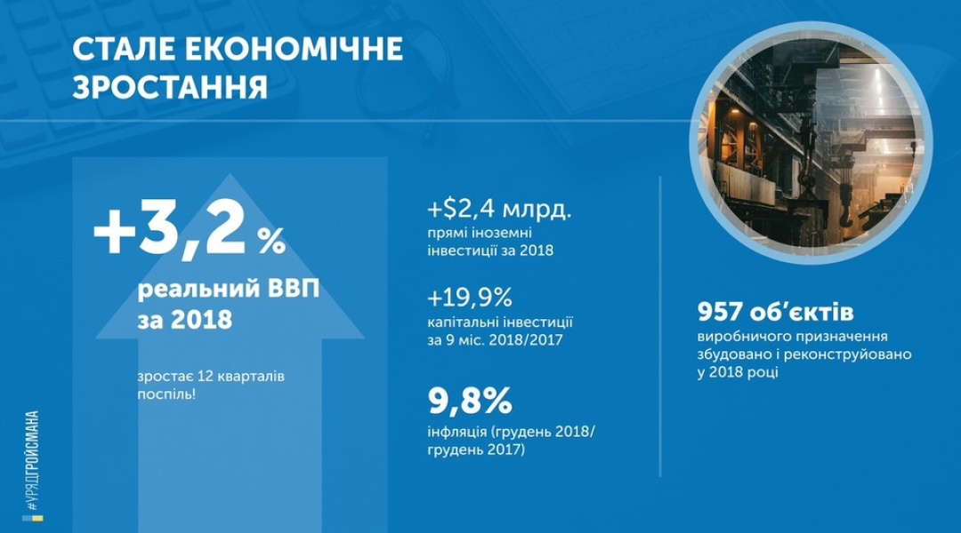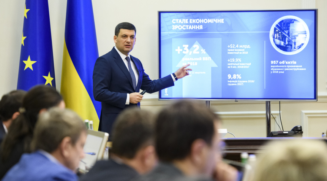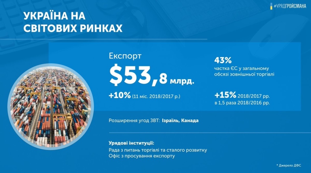 Гройсман, презентуючи на засіданні звіт про роботу уряду за 2018 рік, зазначив, що економіка України зростає три роки поспіль. За 2018 рік отримано понад $53 млрд експортного виторгу. Частка ЄС у загальному обсязі зовнішньої торгівлі становила 43%.