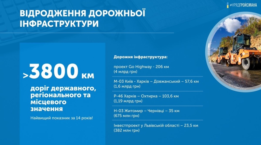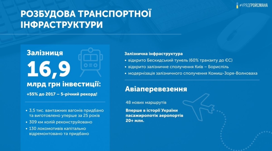 За словами Прем'єр-міністра, у 2018 році залізниця ввела в експлуатацію 3,5 тис. нових вантажних вагонів. Відкрито Бескидський тунель, модернізовано ділянку Комиш – Зоря – Волноваха – важливий вузол на Півдні.