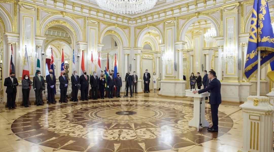 «Сьогодні тут присутні посли з чотирьох континентів, і це чергове свідчення того, що Україна прагне розвивати співпрацю з усіма державами світу», – сказав Президент, вітаючи дипломатів з початком місії в Україні.