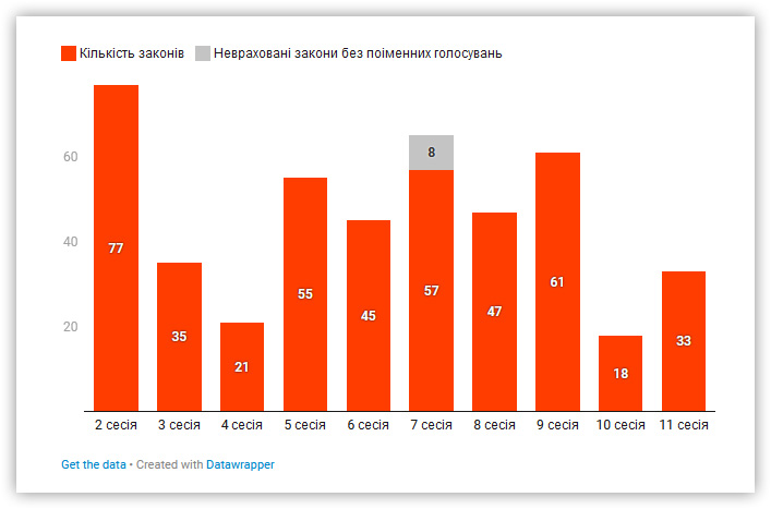 Примітка. Під час сьомої сесії, на початку повномасштабного вторгнення було прийнято вісім законів, результати голосування за які відсутні на сайті ВРУ. Хоча експерти проєкту «Індекс реформ» їх оцінили, для розрахунку ККД депутатів вони не враховувалися. У відповідь на наш запит ВРУ зазначила, що у період з 3 березня по 14 квітня 2023 року голосування у залі засідань здійснювалися за допомогою електронної системи без поіменної фіксації результатів з міркувань безпеки.