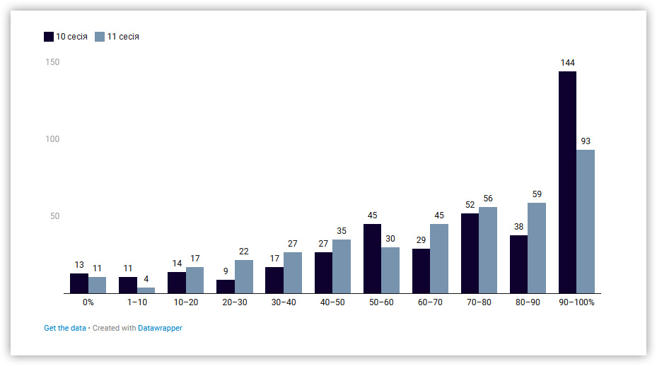 - Майже 60% депутатів знизили свою корисність порівняно з попередніми результатами за 10 сесію: середній показник ККД упав із 70% до 66%.