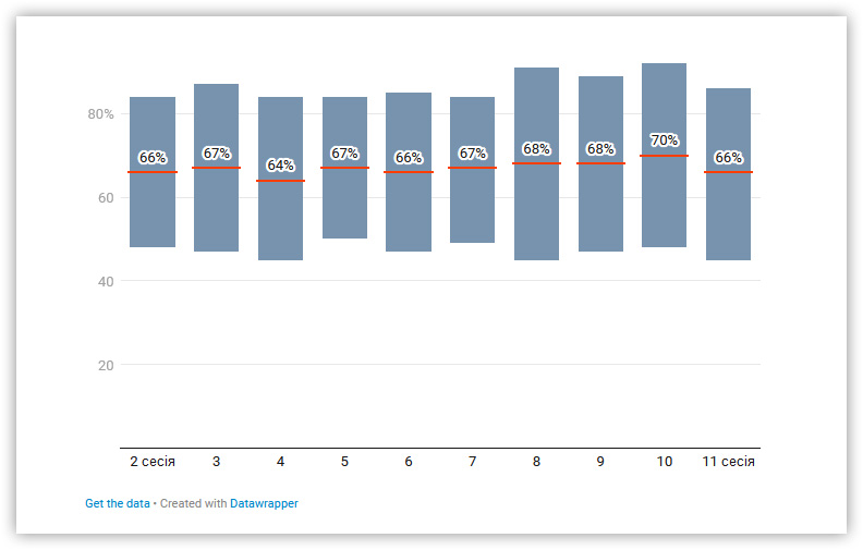 Середній рейтинг за 11 сесію становить 66% (знизився на 4 в.п. порівняно з 10 сесією), а загальний за всі сесії включно з останньою – 68%.