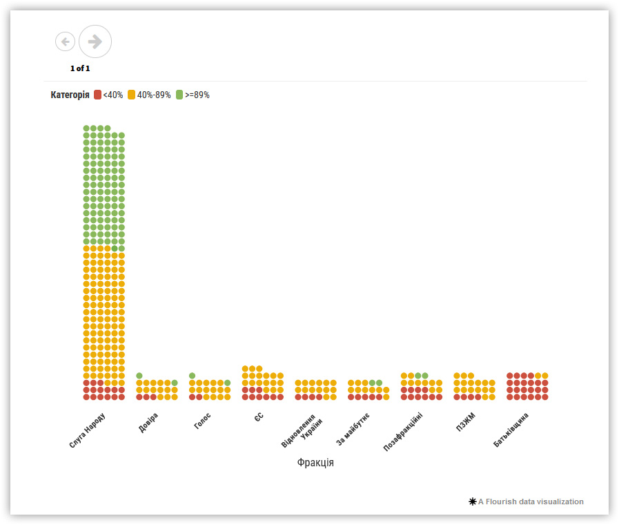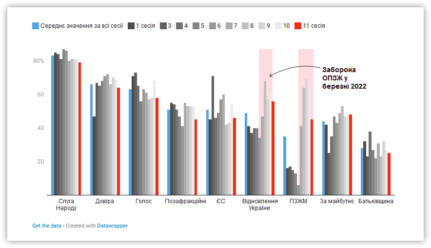 Примітка: на цьому графіку не показана фракція ОПЗЖ, яка працювала у парламенті протягом 1-6 сесій. Члени цієї фракції показані в групах ПЗЖМ та За майбутнє, до яких вони приєдналися після заборони їхньої партії. Чітко видно, що до ПЗЖМ приєдналися найбільші антиреформатори Ради, які кардинально змінили свою поведінку.