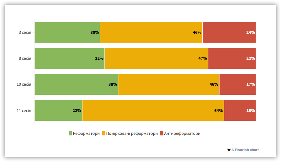 Відсоток реформаторів значно знизився: з 38% на кінець 10 сесії до 22% за результатами 11 сесії. Відповідно на 18 в. п. виросла частка поміркованих реформаторів (з 46% до 64%). Антиреформаторів також поменшало (з 17% стало 15%). Депутати стали голосувати більш усереднено та менш поляризовано, що свідчить про загальну стабілізацію голосувань, але також про втрату парламентом радикального імпульсу до реформ.