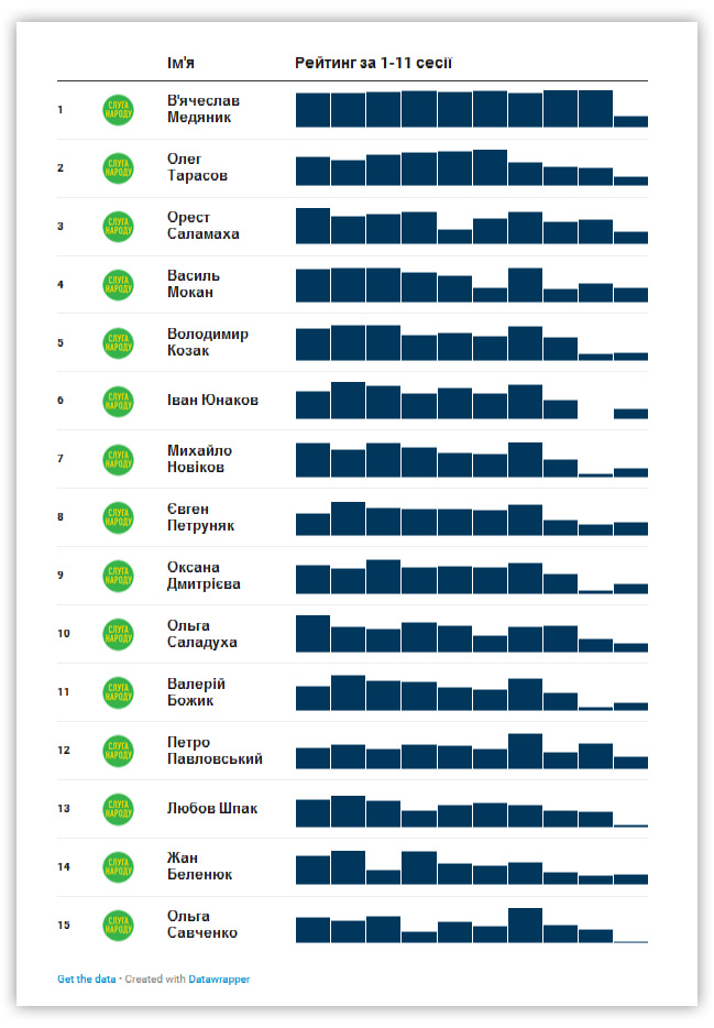 Якщо ви знаєте про об’єктивні та поважні причини відсутності депутата під час голосування, будь ласка, напишіть нам, і ми перерахуємо її/його рейтинг.