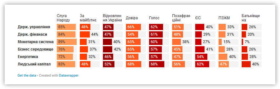 При цьому в інших фракцій підтримка «Монетарної системи» виросла на 1–3% (найбільше у ЄС) а «Бізнес-середовище» має неоднорідну динаміку: підтримка зменшилась у «Довіри» (-1 в.п.), а в інших збільшилась, при чому у «Голосі» результат покращився з 50% до 57%, а у «Батьківщини» – з 16% до 26%.