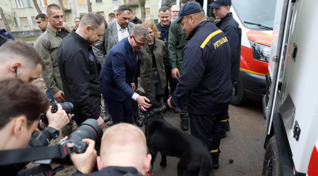 Міністр показав фінській делегації службових собак, які того дня допомагали шукати людей під завалами будинку у Святошинському районі столиці, у тому числі німецьку вівчарку, на ім'я Зеніт, яка врятувала чоловіка, який більше ніж 6 годин перебував під завалами.
