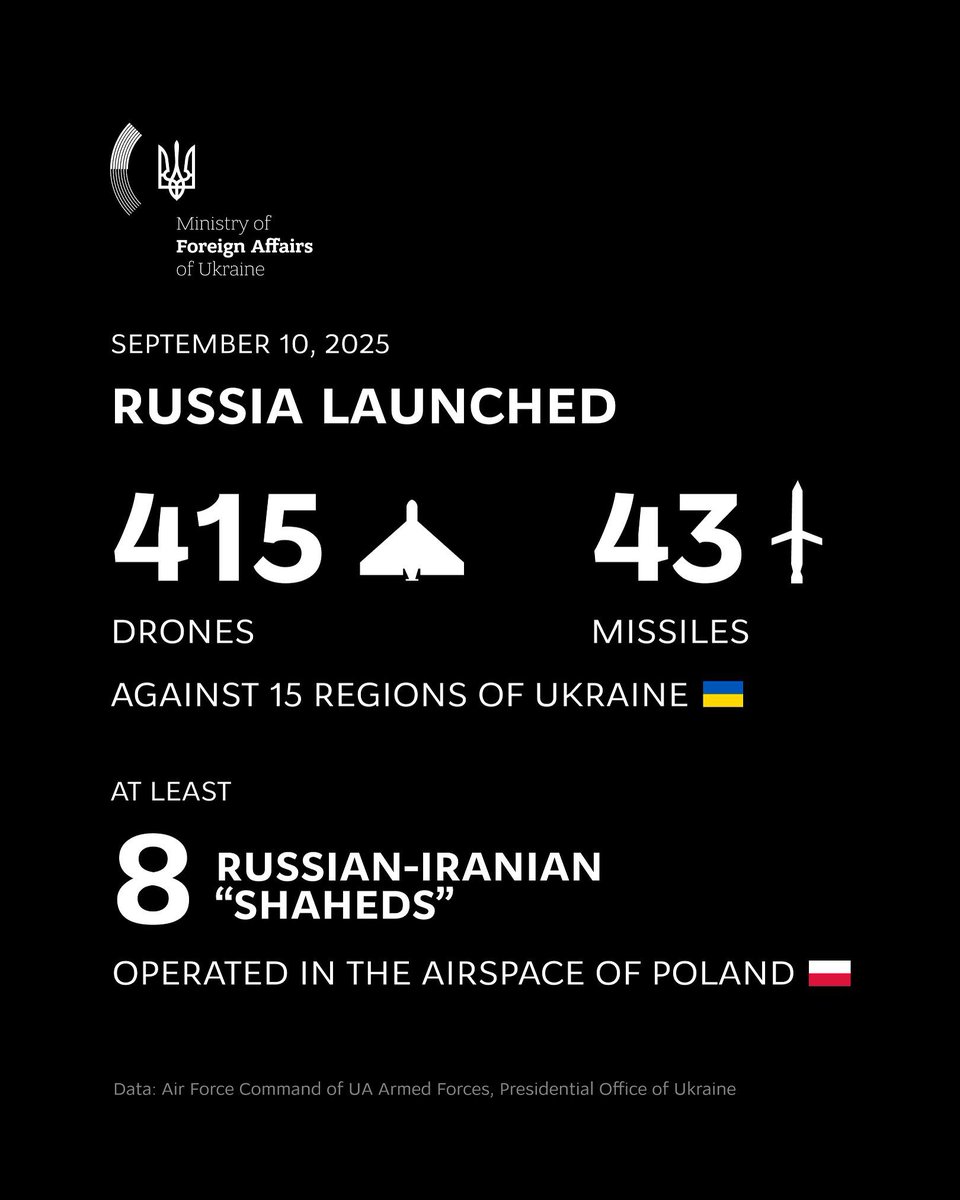 «Сьогодні відбулася чергова ескалація: щонайменше 8 безпілотників Shahed іранського виробництва перетнули повітряний простір Польщі – НАТО. Це був не один безпілотник, який можна було б списати на випадковість, а щонайменше 8 ударних дронів, спрямованих на Польщу», - підкреслили в місії.