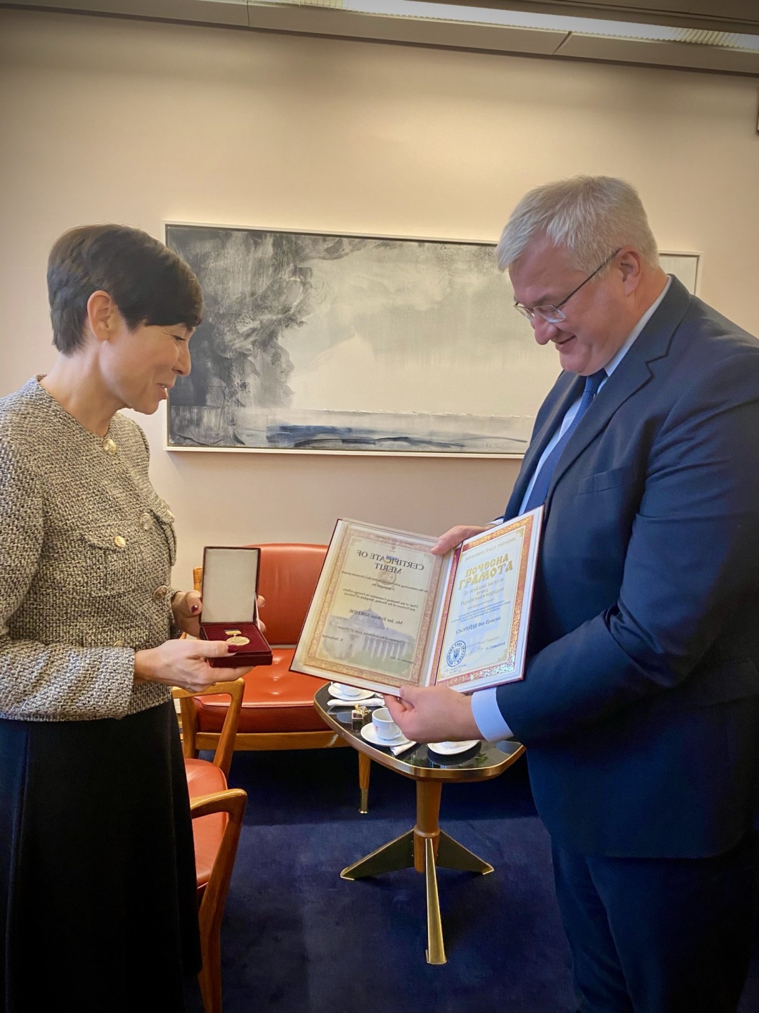 Він подякував за запевнення в подальшій незмінній єдності та солідарності на підтримку України, а також вручив голові Комітету Іне Еріксен Сорейде, Почесну грамоту від Голови Верховної Ради України на знак визнання її видатних зусиль у підтримці народу України.