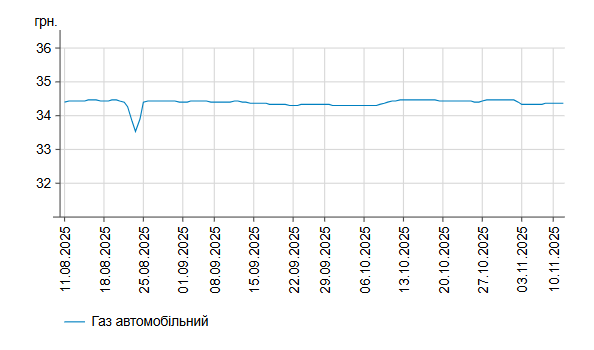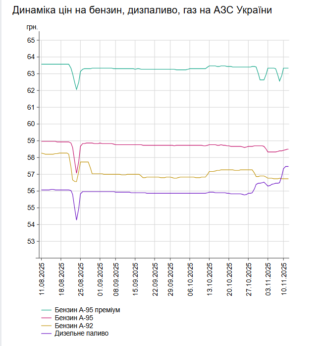 Як повідомлялося, у понеділок, 10 листопада, середня ціна на бензин марки А-95 зросла на 5 коп. до 58,44 грн/л, на дизельне пальне - на 81 коп. до 57,32 грн/л.