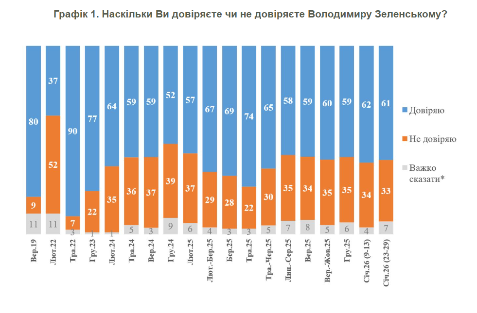 Як повідомляв Укрінформ, згідно з опитуванням КМІС, проведеним 26 листопада - 29 грудня 2025 року, Зеленському довіряли 59% опитаних українців, не довіряли 35%.