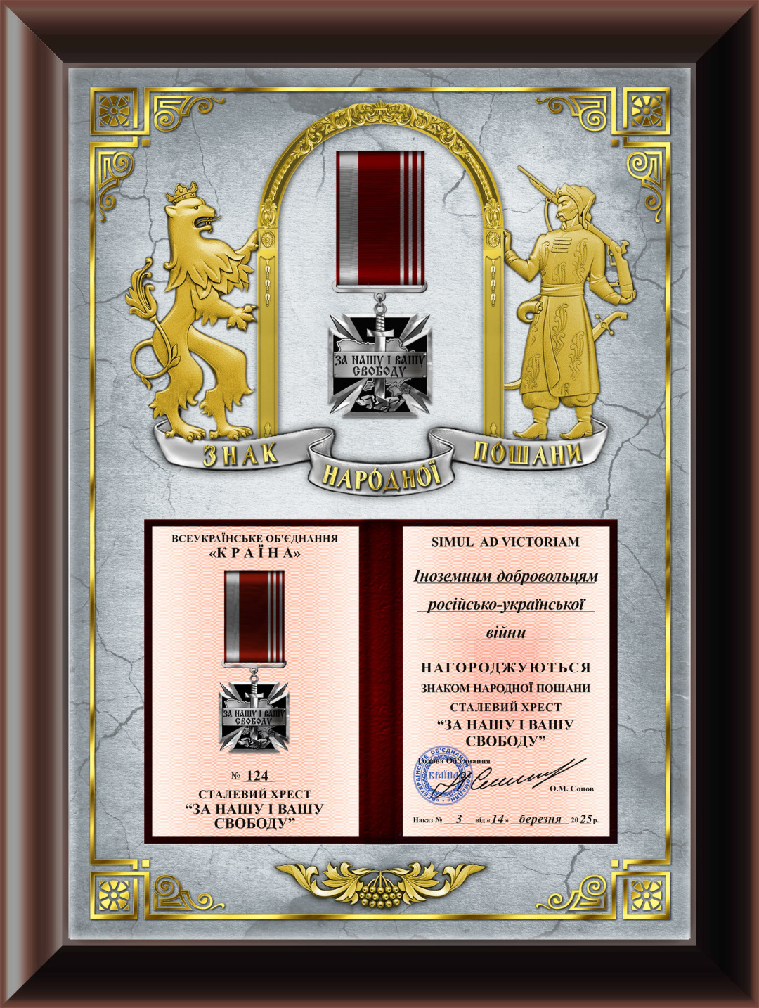 Коротко. 14 березня, в День українського добровольця, відбудеться вручення вищих колективних нагород України - «Сталевий хрест «За вашу і нашу свободу» (на плакетках) іноземним добровольцям - захисникам України.