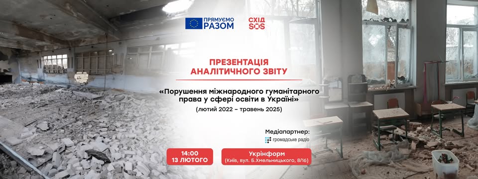 13 лютого о 14:00 відбудеться презентація аналітичного звіту: «Порушення міжнародного гуманітарного права у сфері освіти в Україні (лютий 2022 – травень 2025)».