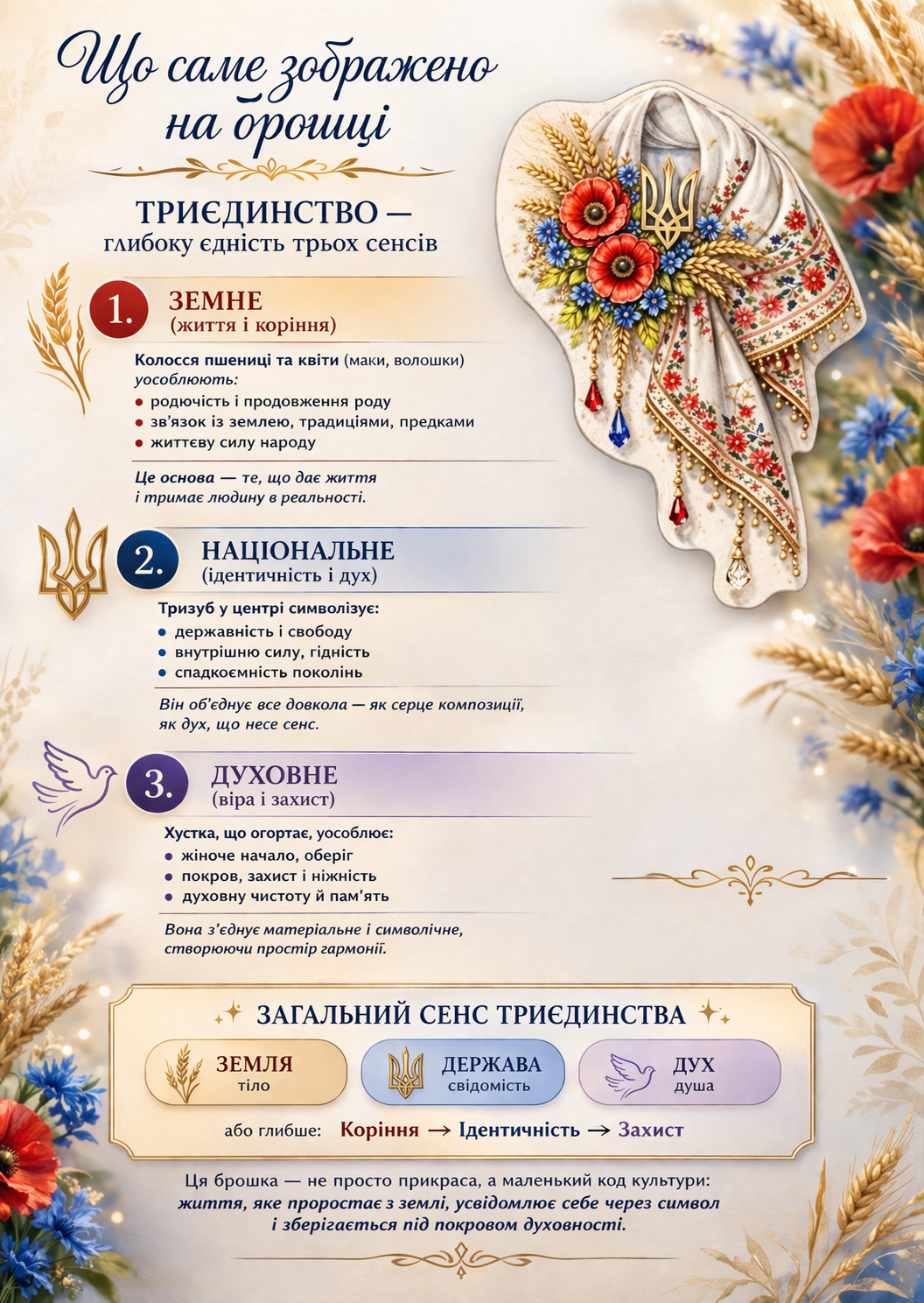 Це не просто прикраса — це глибокий культурний символ України. Брошка як артоб’єкт несе в собі сенс, історію та контекст нашого часу. Це символ епохи, закладений у триєдності: Земля — Держава — Дух. Це символ України сьогодні.