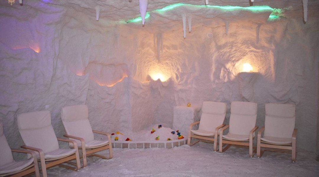 Стіни тут викладені плиткою з природної кам`яної солі, що дає лікувальний ефект при бронхіті, риніті, фарингіті, синуситі, а також із астмі, неврозі, дерматозі, алергії, хворобах серця та опорно-рухового апарату.