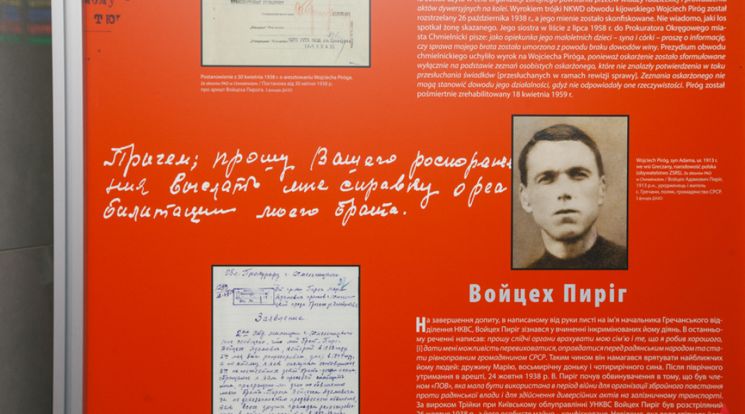 «Ця виставка висвітлює один із епізодів доби Великого терору 1937-1938 років у СРСР. В експозиції представлені матеріали про репресивну акцію, яку було проведено за так званою «національною лінією» проти польського населення України. Зауважимо, що абсолютну більшість жертв «польської операції» НКВС становили поляки - їх репресували у 39 разів частіше за інших, але серед репресованих були також представники інших національних і етнічних груп, що проживали в CРСР, зокрема, велика кількість українців», - розповів Гула.