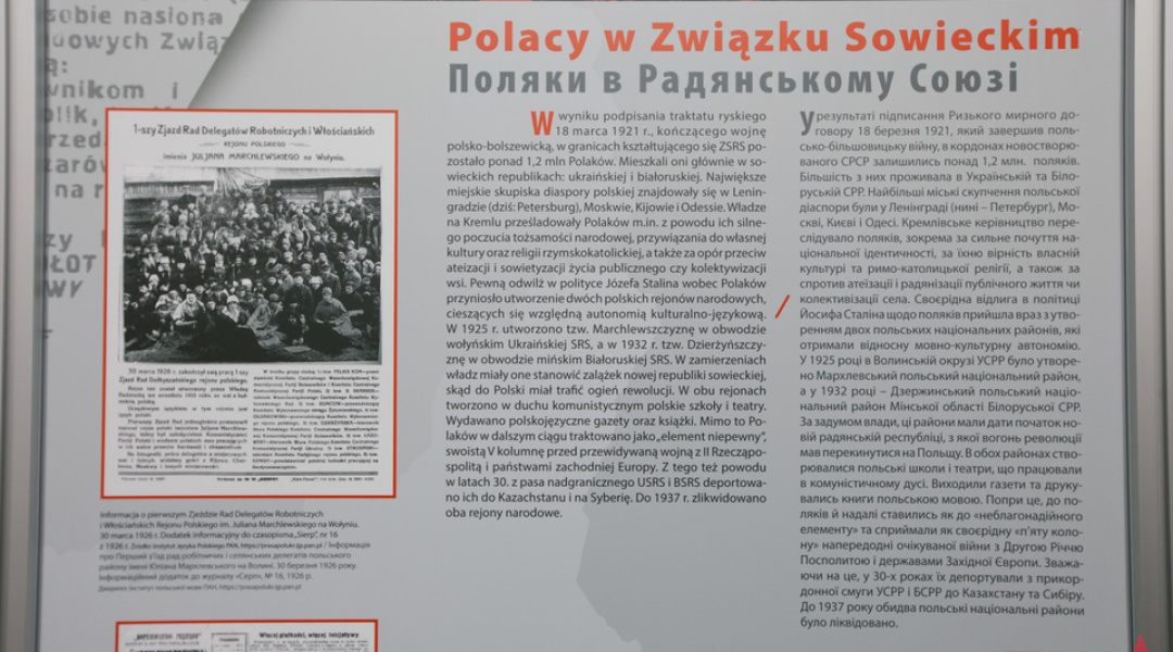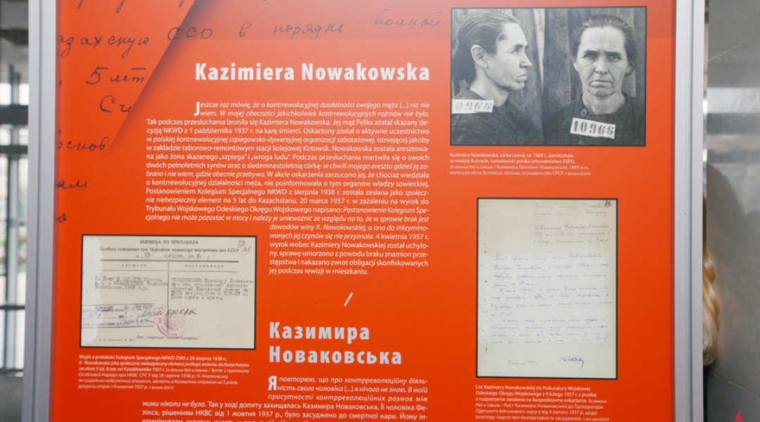 Серед експонатів виставки – документи, які розповідають, яким чином значна кількість поляків з’явилася на теренах правобережної України та Вінниччини зокрема, а також про особливості великого терору НКВС проти поляків. Адже тоді польське населення вважалося сталінським режимом ворожим до радянської влади і таким, що працює на розвідку буржуазної, а потім – і фашистської Польщі. Окрім жертв Великого терору, на виставці представлені й відомості про їхніх катів.