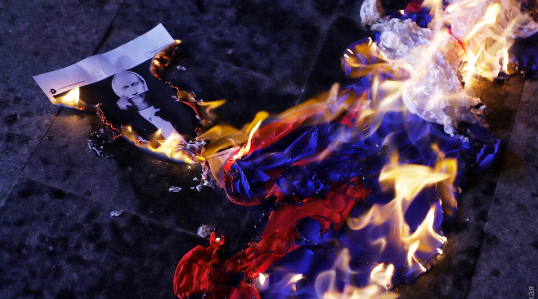 Патріоти спалили російський прапор і розклеїли антипутінські листівки.