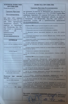 Гришина також викликають до прокуратури 3 вересня на 10:00 для участі у слідчих діях. Фото повістки оприлюднено на сайті прокуратури.