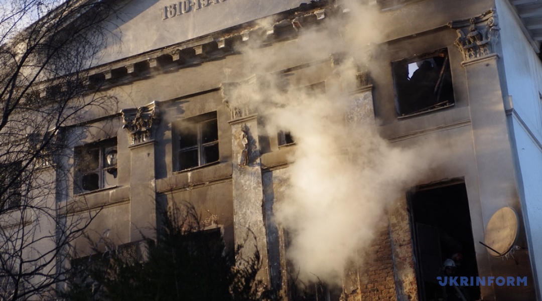 Будинок Дворянського зібрання уже раз горів, у 1943-му. Тоді він був знищений фашистами. Та в 1944-46-му був відбудований полтавцями саме під кінотеатр. У 2020-му історичну будівлю знищили доморощені варвари.