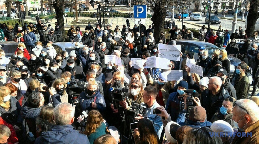 Наразі на протест прийшли кілька десятків людей. Вони зазначають, що за рік карантинних обмежень понесли збитки, а компенсації отримали мізерні. Тож підприємці вимагають скасувати обмеження та дозволити роботу Калинівського ринку в Чернівцях та інших підприємств.