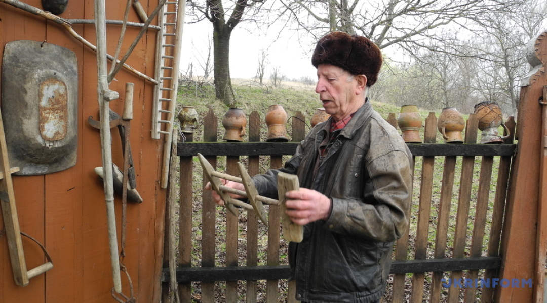 «Частину своїх експонатів я тримаю просто на подвір’ї. Тут є інструменти, якими користувалися місцеві жителі 100 і більше років тому. Колись наші люди займалися землеробством і тваринництвом. Усе обробляли вручну та з допомогою найпростіших знарядь праці», – розповідає наш екскурсовод.