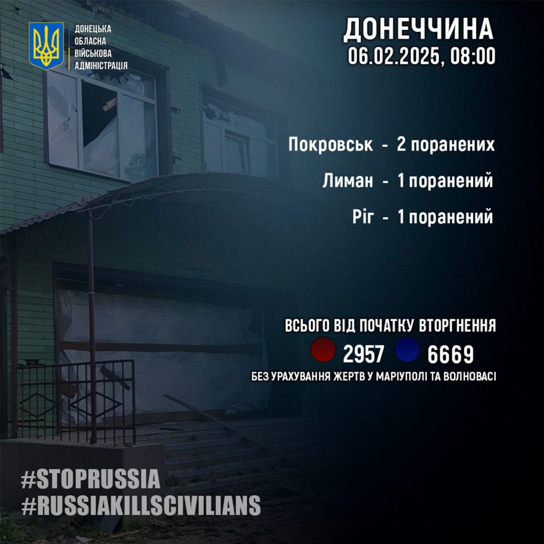"За 5 лютого росіяни поранили чотирьох жителів Донеччини: двох у Покровську, одного у Лимані і Розі", - зазначив Філашкін.