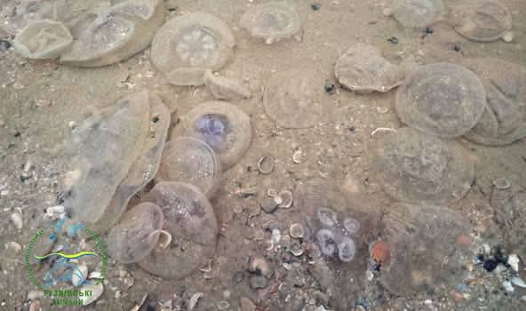 «Обстежуючи днями одну з ділянок нацпарку, ми виявили 2 км узбережжя, на якому було викинуто багато медуз виду Аурелія ушаста - Aurelia aurita. Їх тільки на піску, на межі з водою, ми нараховували 2-3 медузи на 1 м пересипу. А загалом тільки на піску біля води було майже 5000 дрібних медуз розмірами від 2 до 10 см (у середньому 5 см)», - повідомив еколог.
