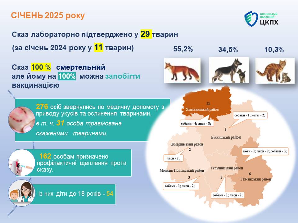 Згідно з оприлюдненою відомством інфографікою, якщо у січні 2024 року було зафіксовано 11 лабораторно підтверджених випадків сказу у тварин, то цьогоріч їхня кількість становить вже 29.