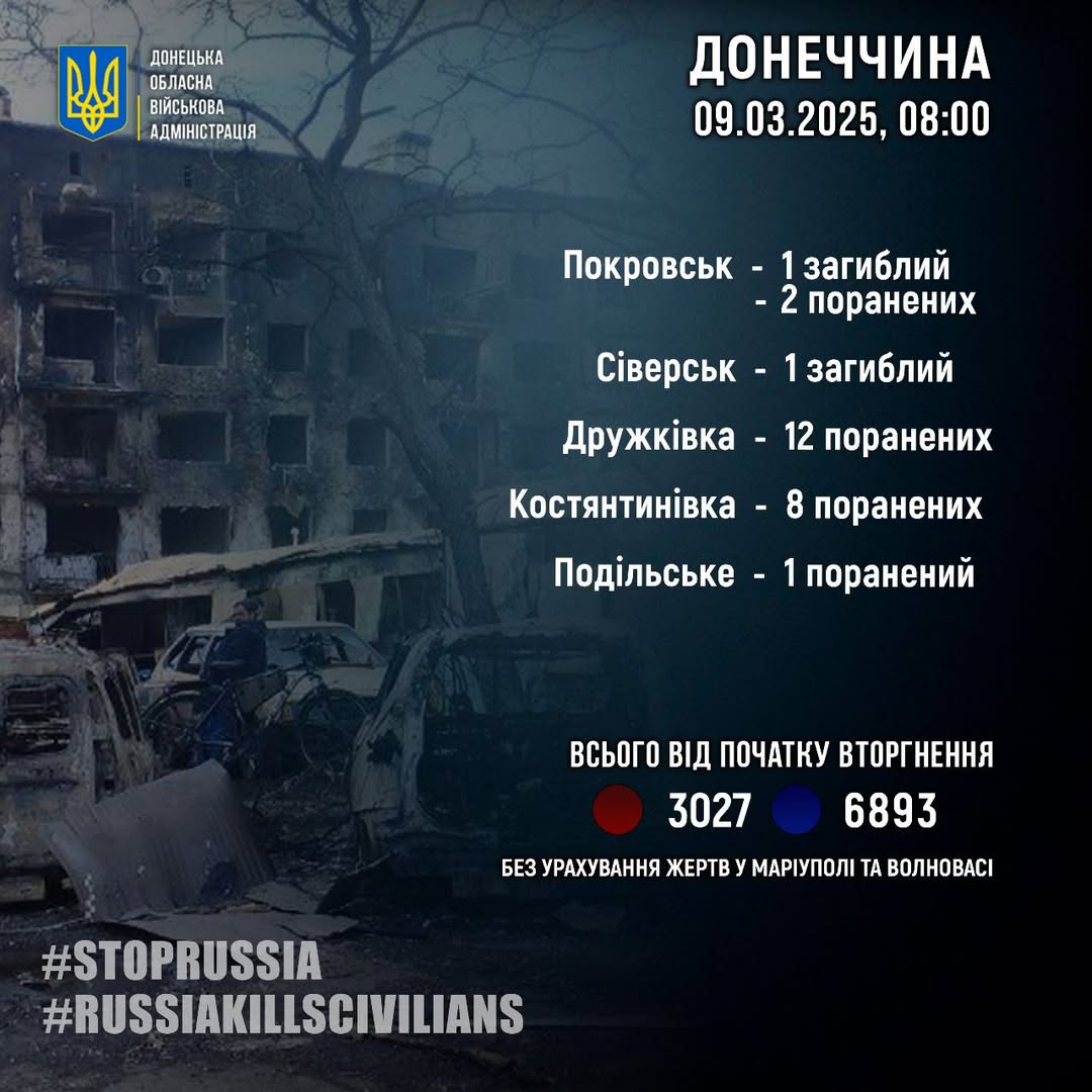 «За 8 березня росіяни вбили 2 жителів Донеччини: у Покровську і Сіверську. Ще 23 людини в області за добу дістали поранення», - написав Філашкін.