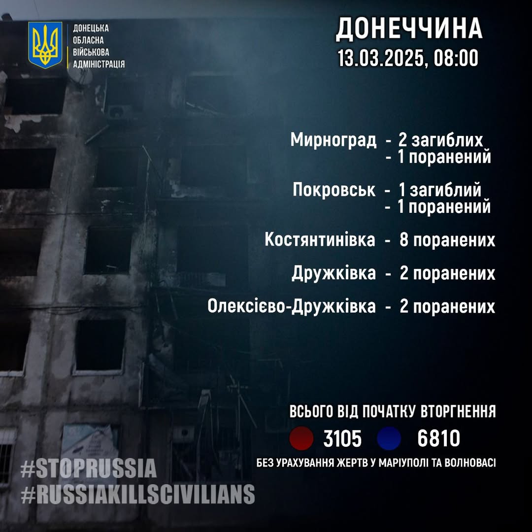 «За 12 березня росіяни вбили 3 жителів Донеччини: 2 у Мирнограді і 1 у Покровську. Ще 14 людей в області за добу дістали поранення», – зазначив він.