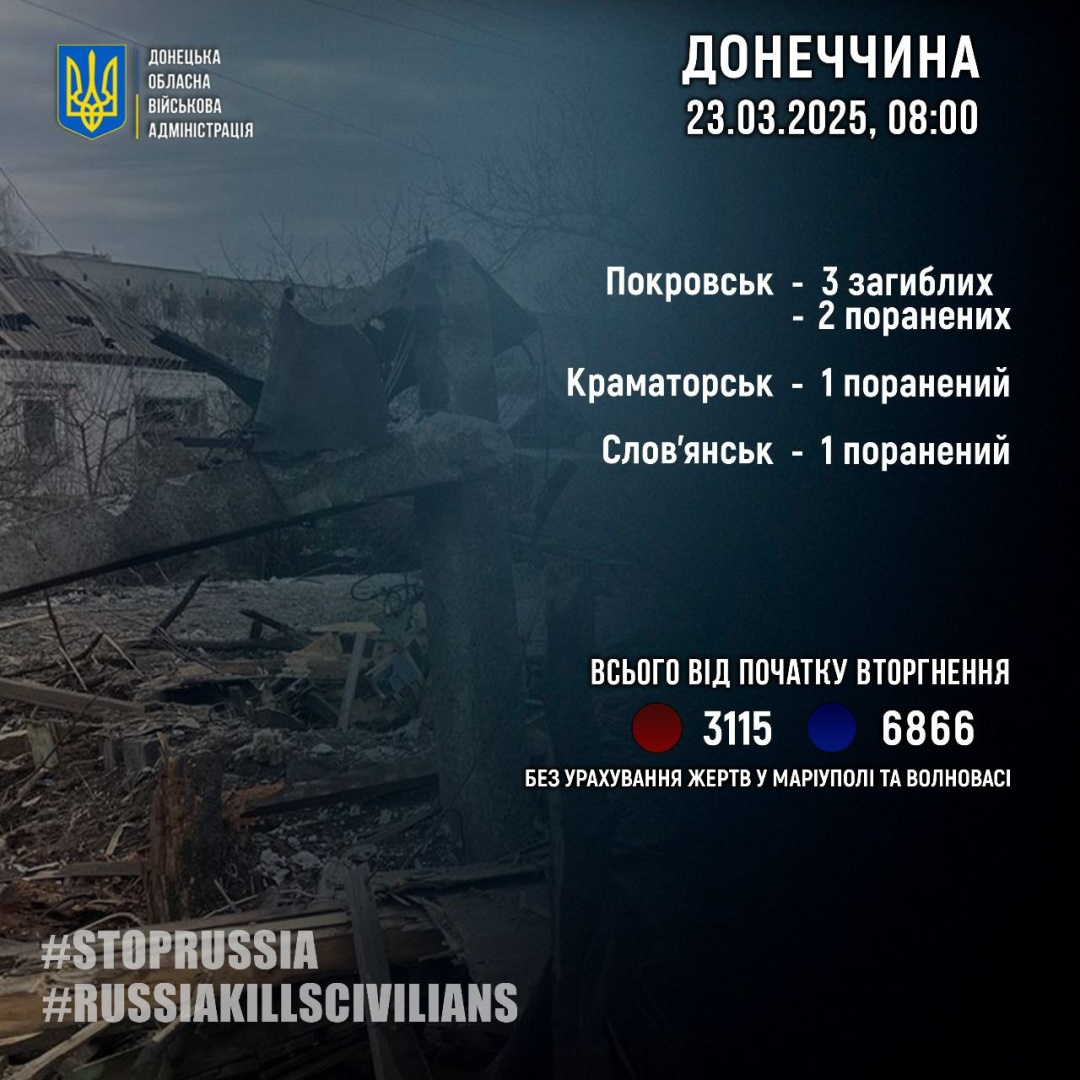 "За 22 березня росіяни вбили 3 жителів Донеччини: у Покровську. Ще 4 людини в області за добу дістали поранення", - йдеться у повідомленні.