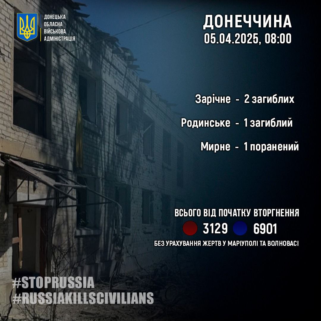 Як повідомлялось, за 3 квітня росіяни вбили одного жителя Донеччини у Костянтинівці, ще п’ятеро людей в області за добу дістали поранення.