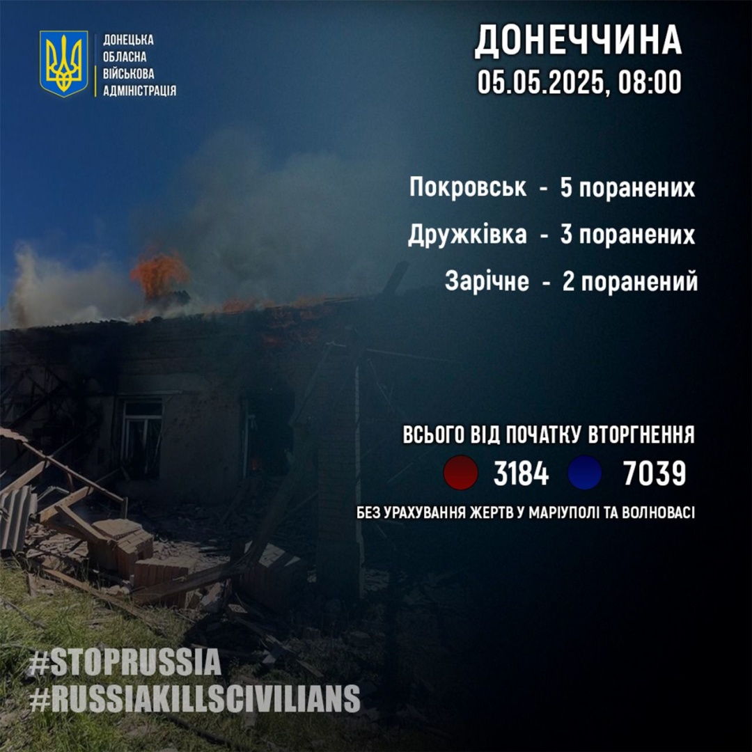 За його словами, росіяни поранили п'ятьох людей у Покровську, трьох - у Дружківці і двох - у Зарічному.