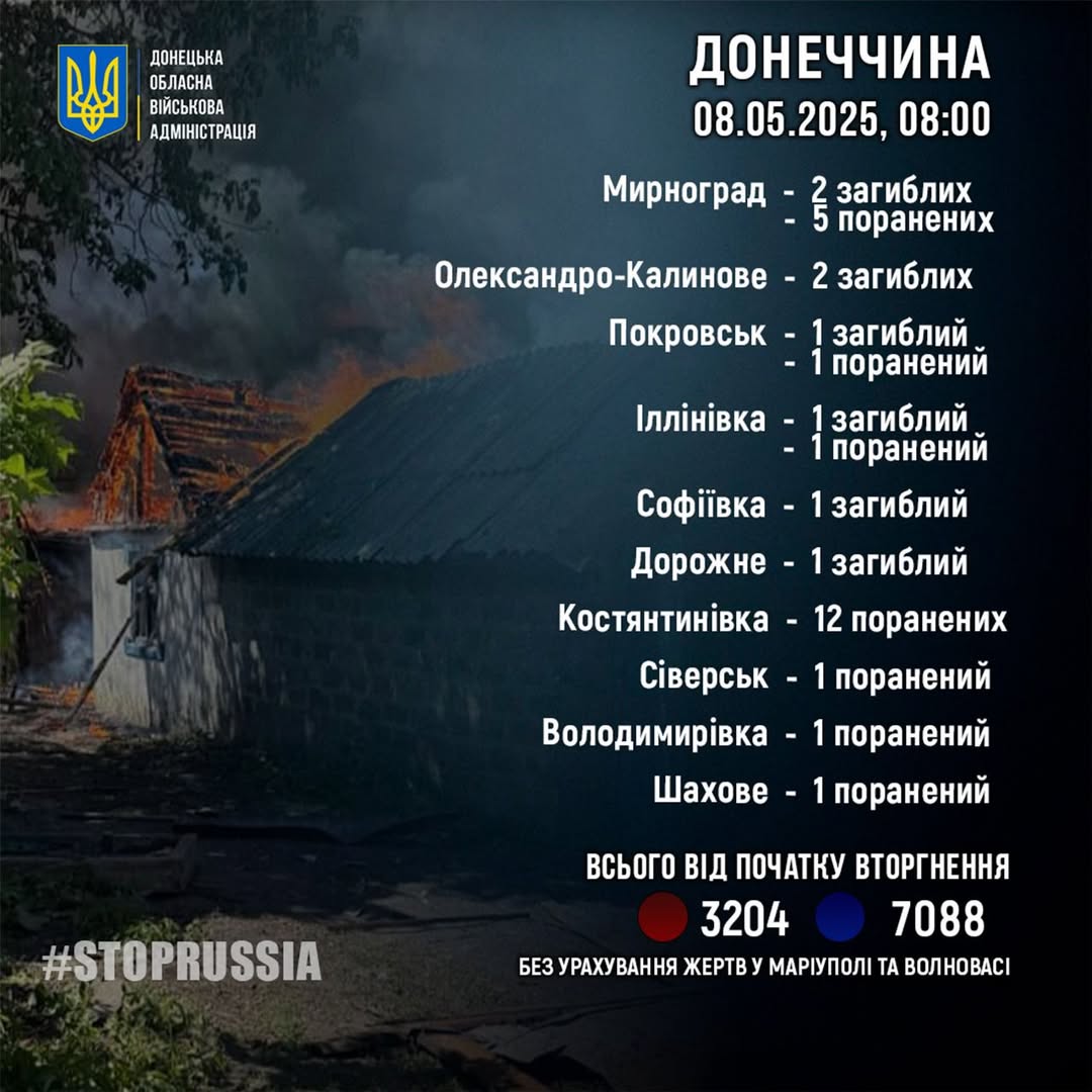 За його словами, 7 травня росіяни вбили вісьмох жителів Донеччини: по 2 у Мирнограді та Олександро-Калиновому, по 1 в Покровську, Іллінівці, Софіївці і Дорожньому. Ще 23 людини дістали поранення.