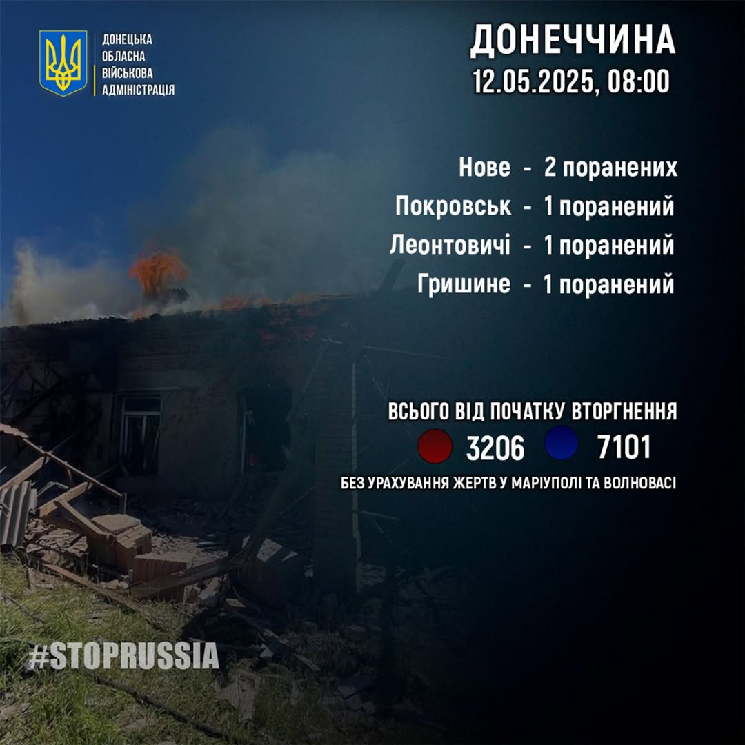 Пізніше в поліції області уточнили, що війська РФ за 11 травня завдали 2 919 ворожих ударів по лінії фронту та житловому сектору Донеччини. Руйнувань зазнали 41 цивільний об’єкт, з них 5 житлових будинків.
