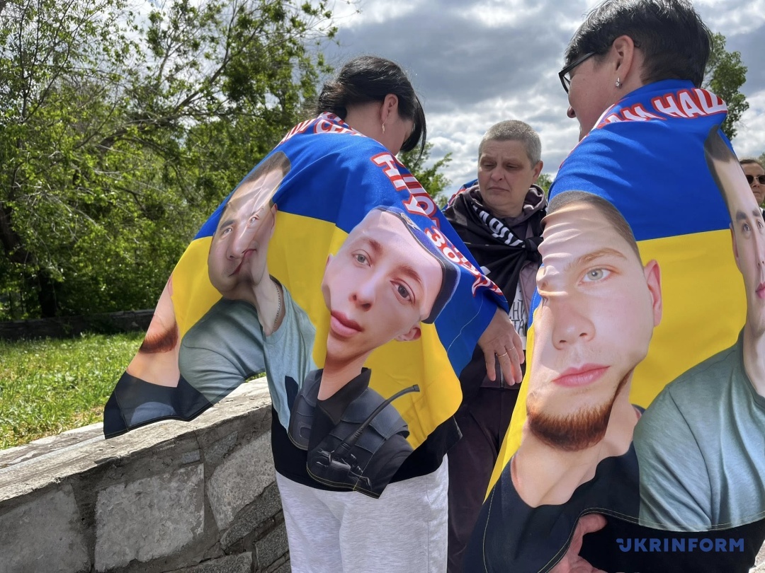 «Волю гарнізону Маріуполя. НГУ 3033» – з таким прапором стояла жінка на ім’я Валентина. ЇЇ син Станіслав потрапив у полон у 2022 році, з комбінату «Азовсталь».