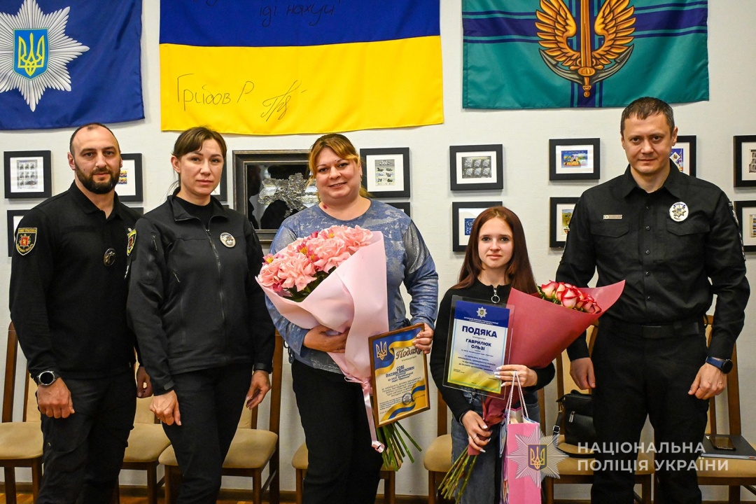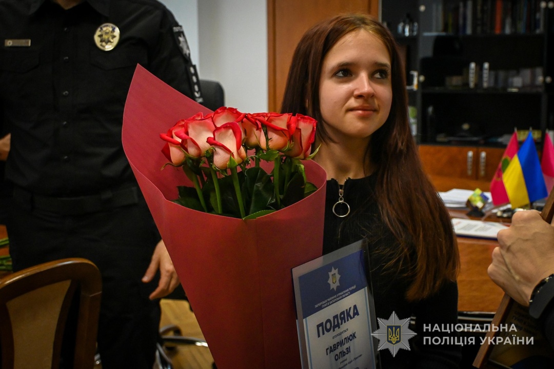 Дев'ятикласниця не розгубилася і про вказаний факт одразу ж повідомила інспектору сектору організації освітньої безпеки. Керівники Запорізького райуправління поліції Сергій Бичін і сектору організації освітньої безпеки Наталія Солод зустрілися з дівчиною, подякували їй за небайдужість і вчасну реакцію та відзначили подяками й подарунками. Матері також висловили вдячність за належне виховання.