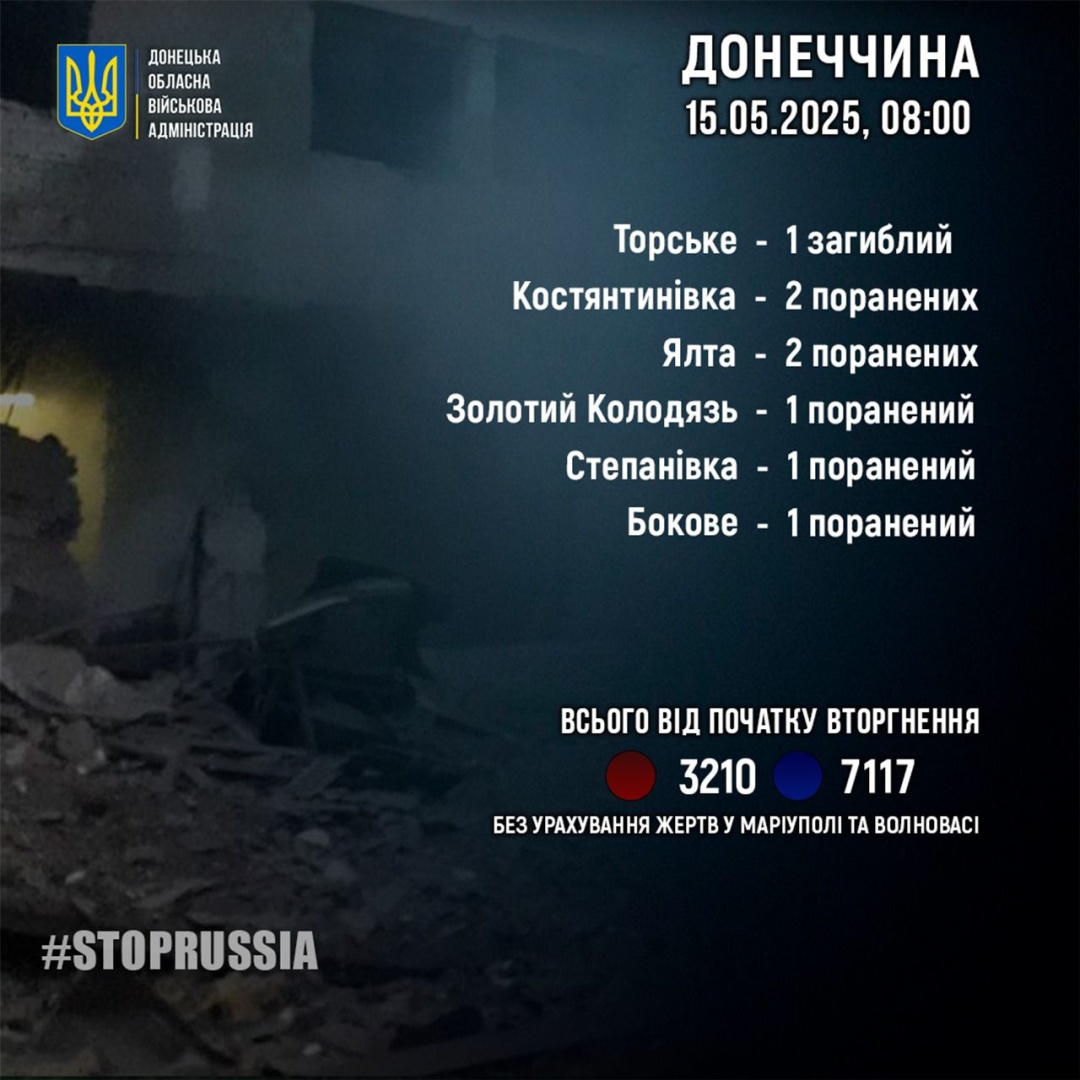 Зазначається, що ворог накрив вогнем 12 населених пунктів: міста Костянтинівка, Дружківка, селище Олексієво-Дружківка, села Довга Балка, Золотий Колодязь, Іванопілля, Іллінівка, Олександро-Калинове, Степанівка, Торське, Яблунівка, Ялта. Зокрема село Торське росіяни атакували БпЛА, у результаті загинула людина.