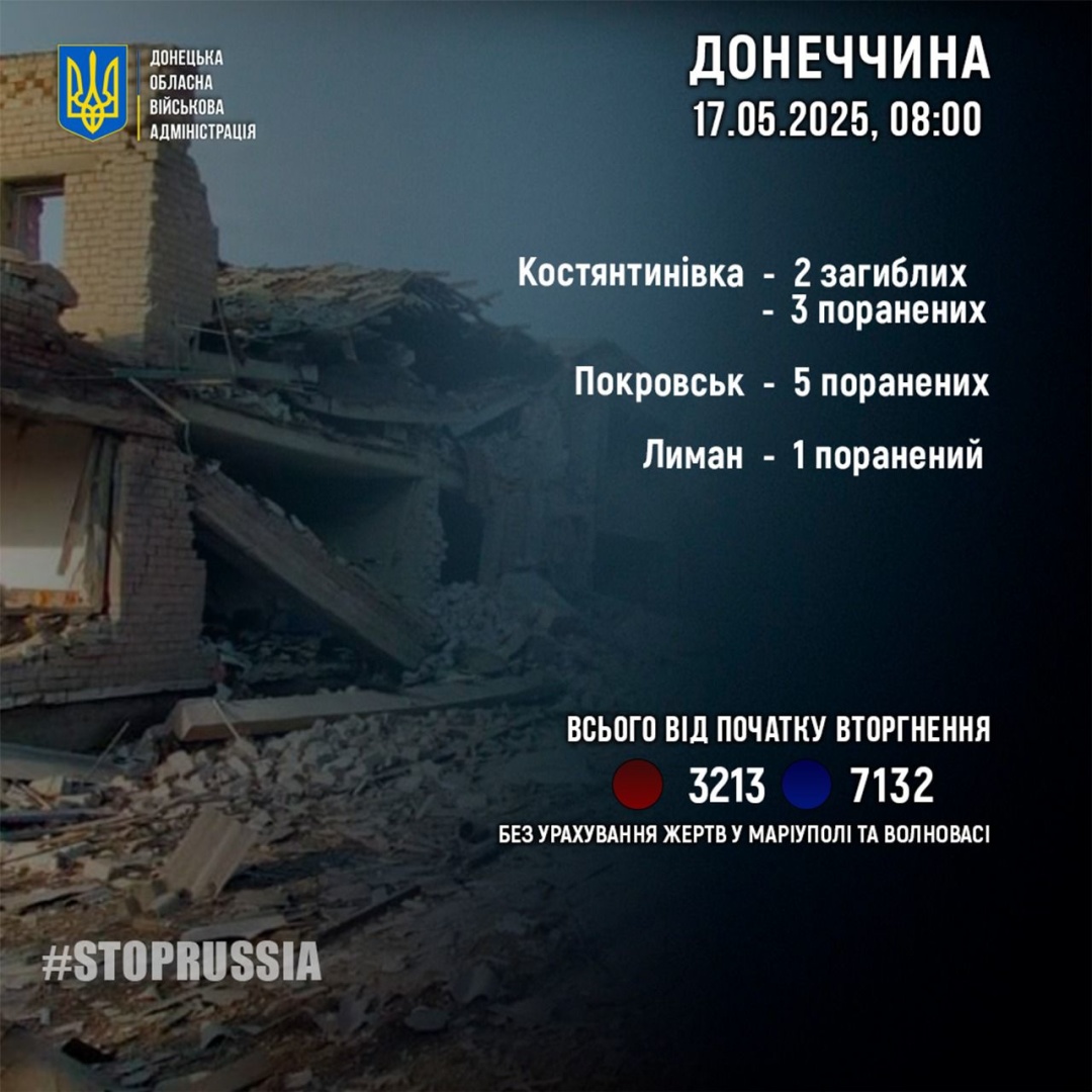 "За 16 травня росіяни вбили 2 жителів Донеччини: в Костянтинівці. Ще 9 людей в області за добу дістали поранення", - йдеться у дописі.