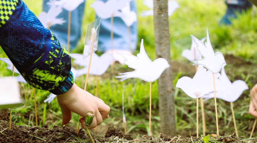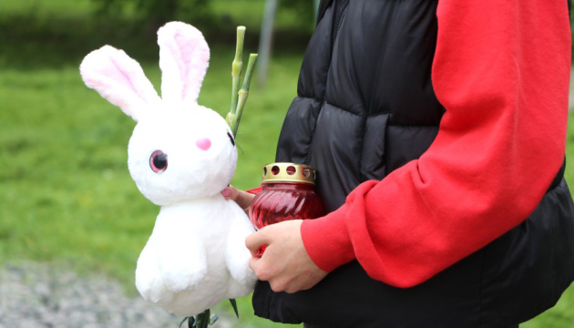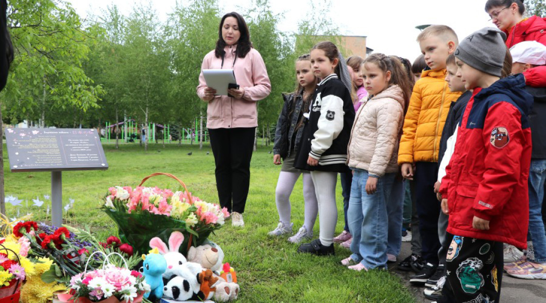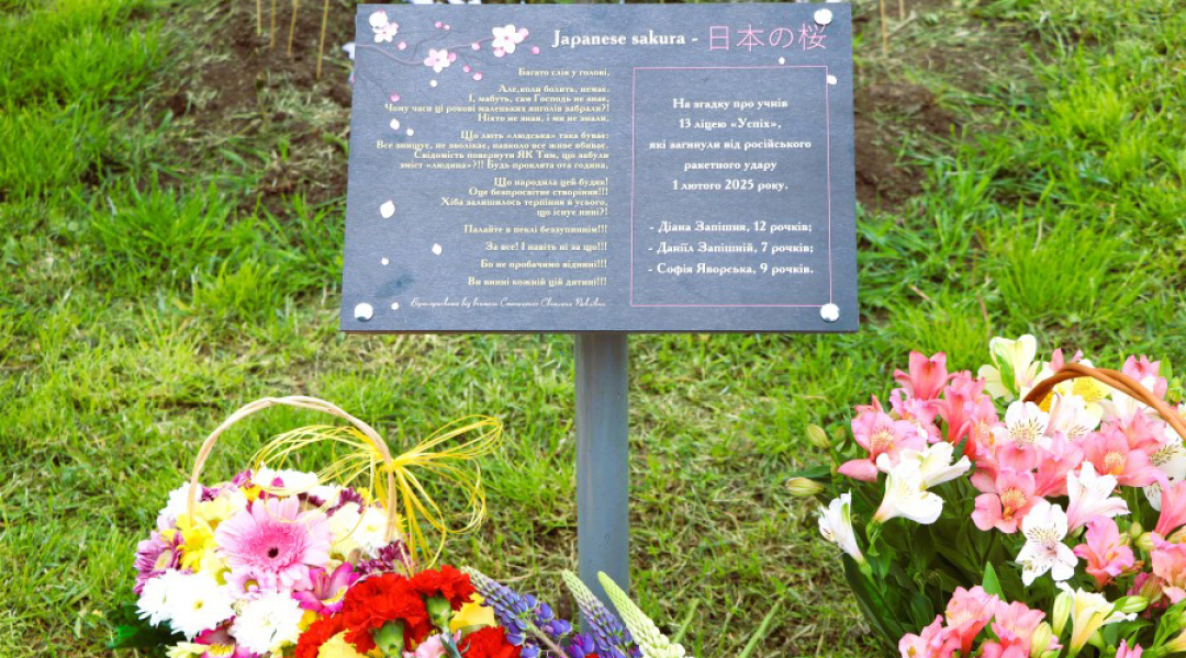 Біля раніше висадженої сакури встановили пам’ятну табличку з іменами дітей та стенд із фотографіями та їхніми малюнками.