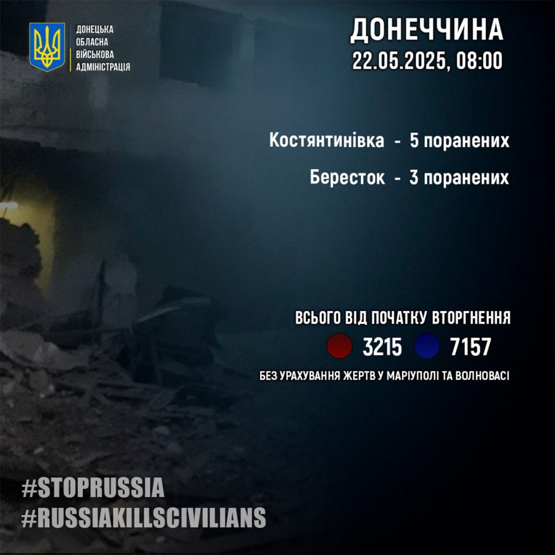За його словами, 21 травня росіяни поранили п'ятьох жителів Костянтинівки та трьох Берестка.