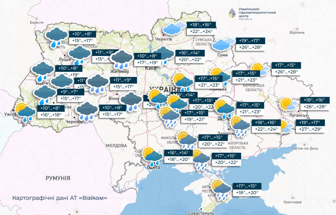 За даними синоптиків, температура в західних, Житомирській та Вінницькій областях удень 14-19°, на решті території 18-23°, у східних та Сумській областях 24-29°.
